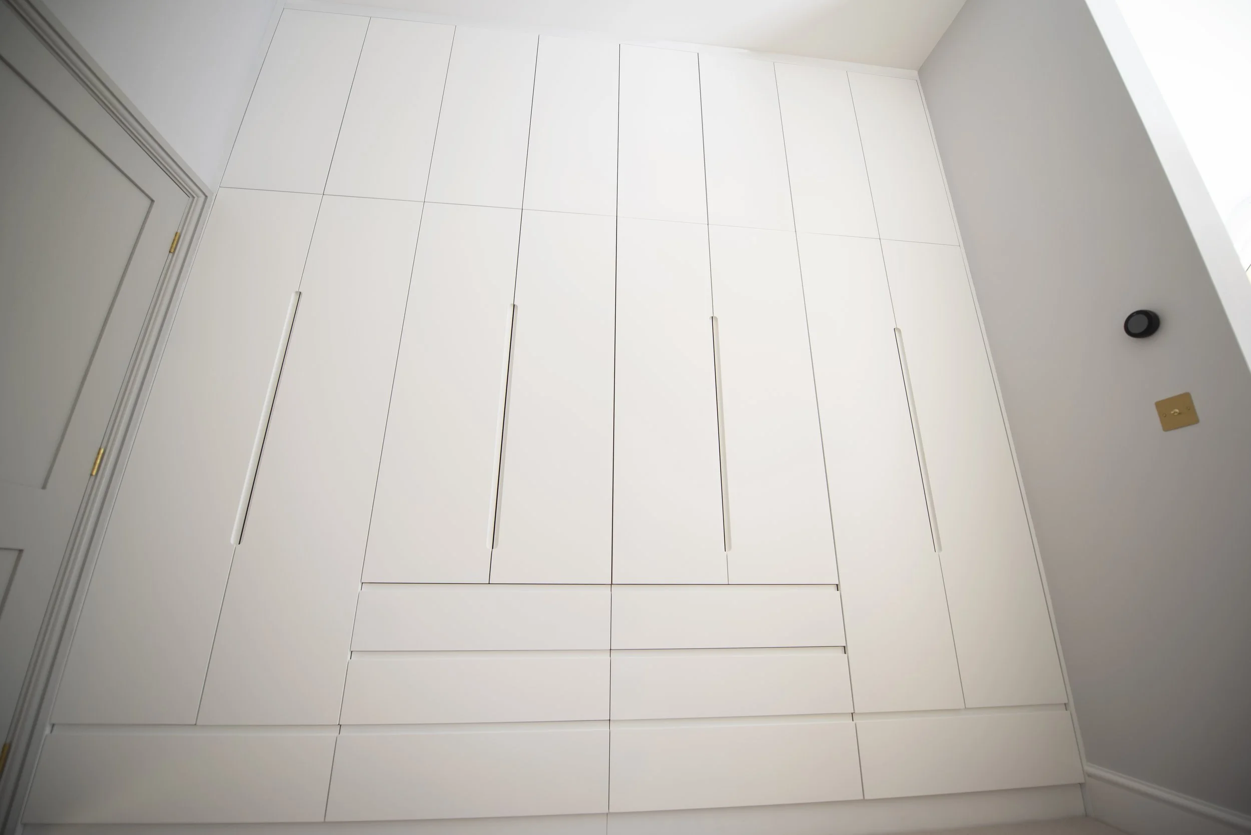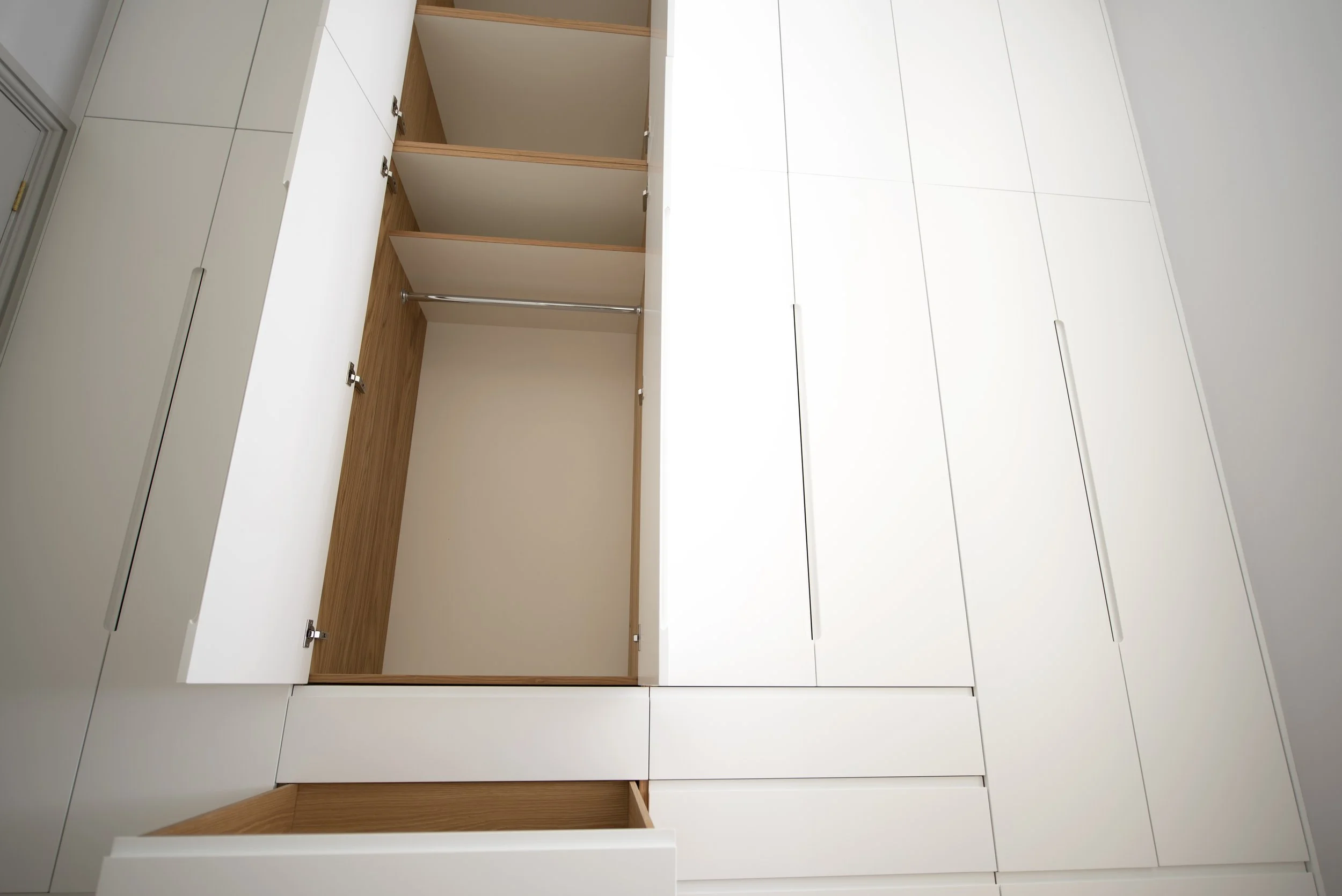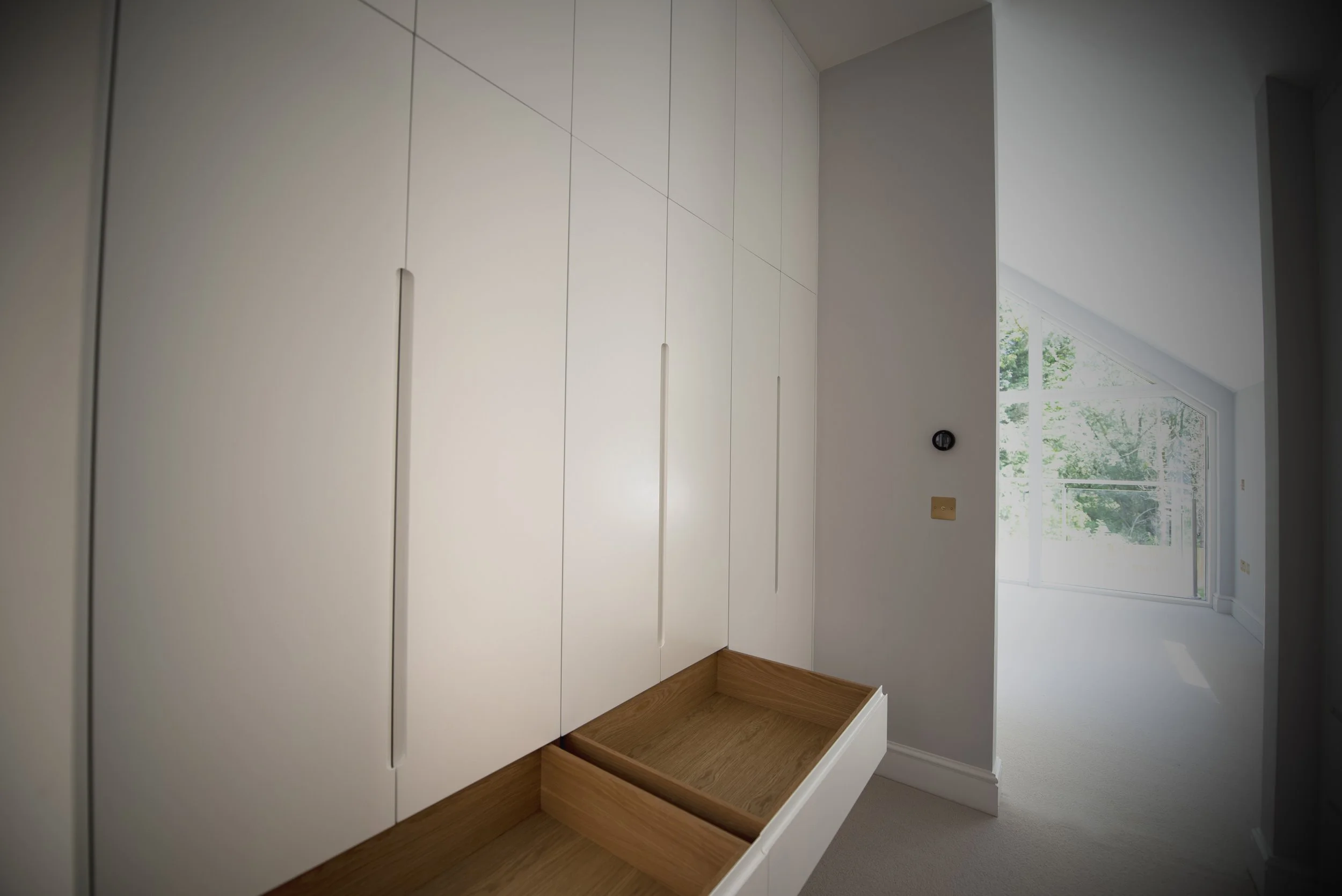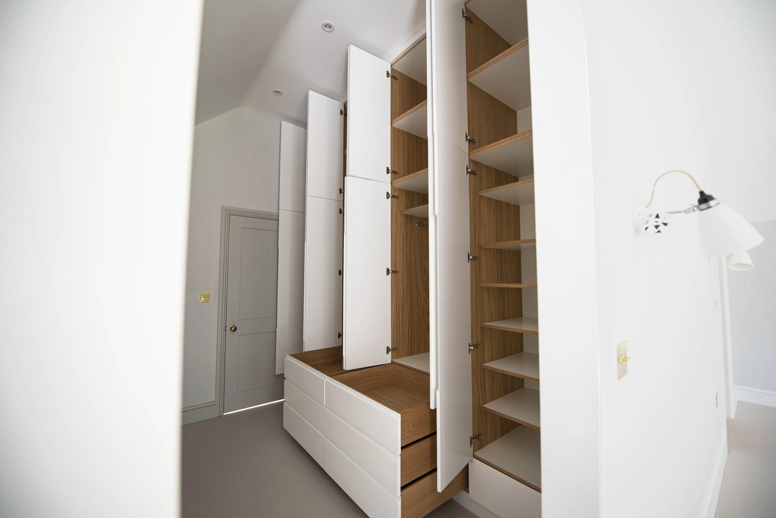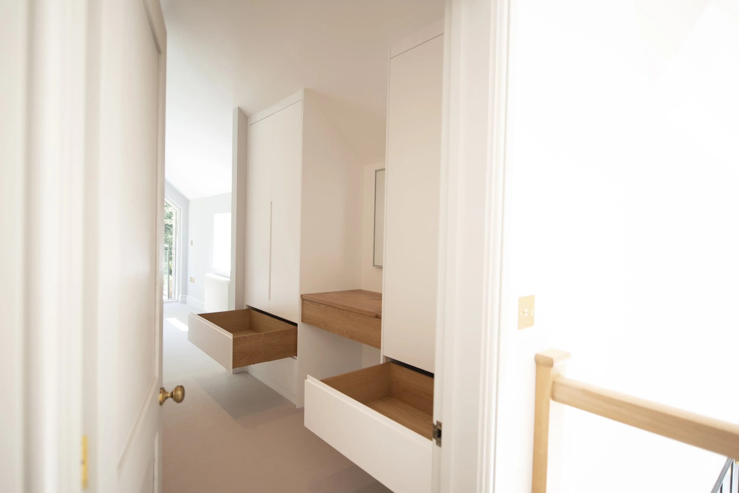 Ickleton, Cambridgeshire, Eco - House Walk in Wardrobe & Vanity unitMaterials: Oak veneer, solid oak, real wood oak edging & colour core units. Finishes: Satin White sprayed & hand oiled oak.All mechanisms: soft closed & concealed.